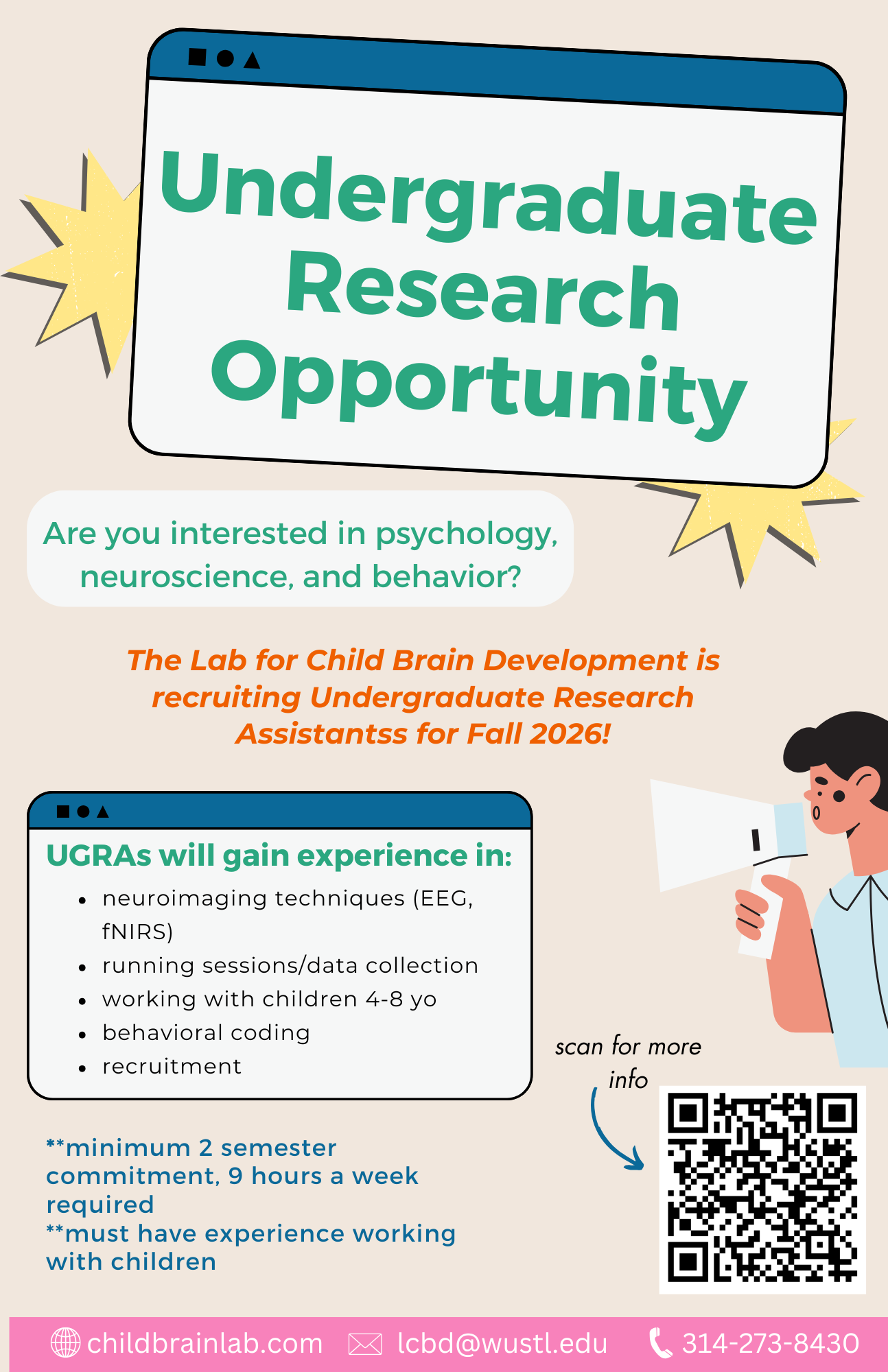 The LCBD is interested in recruiting undergraduate research assistants for Fall 2026 and Spring 2027. RAs will engage in any of the following activities based on personal interests as well as the overall needs of the laboratory: behavioral coding of recorded interactions, questionnaire data entry, MRI data preprocessing, and recruitment.